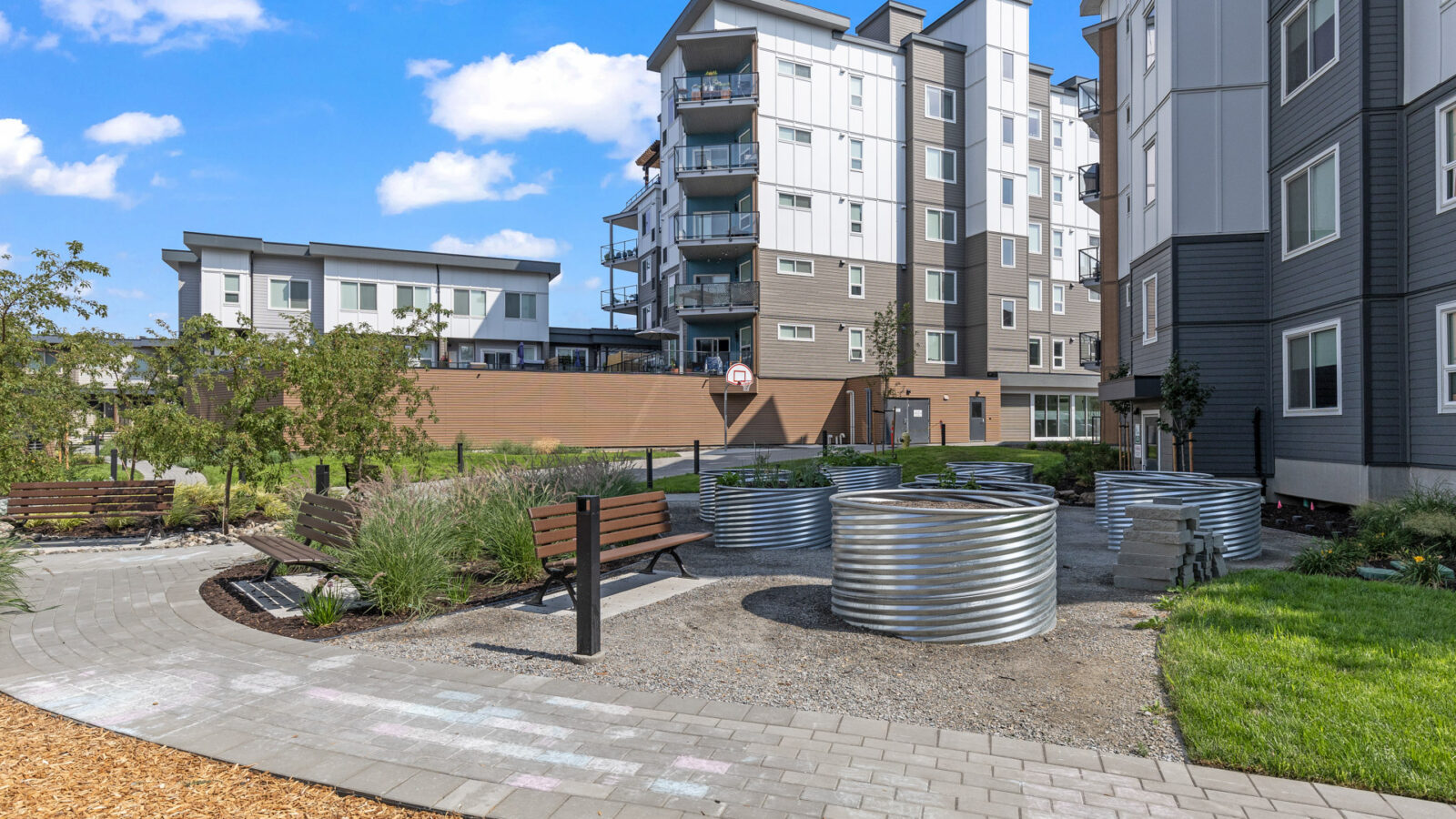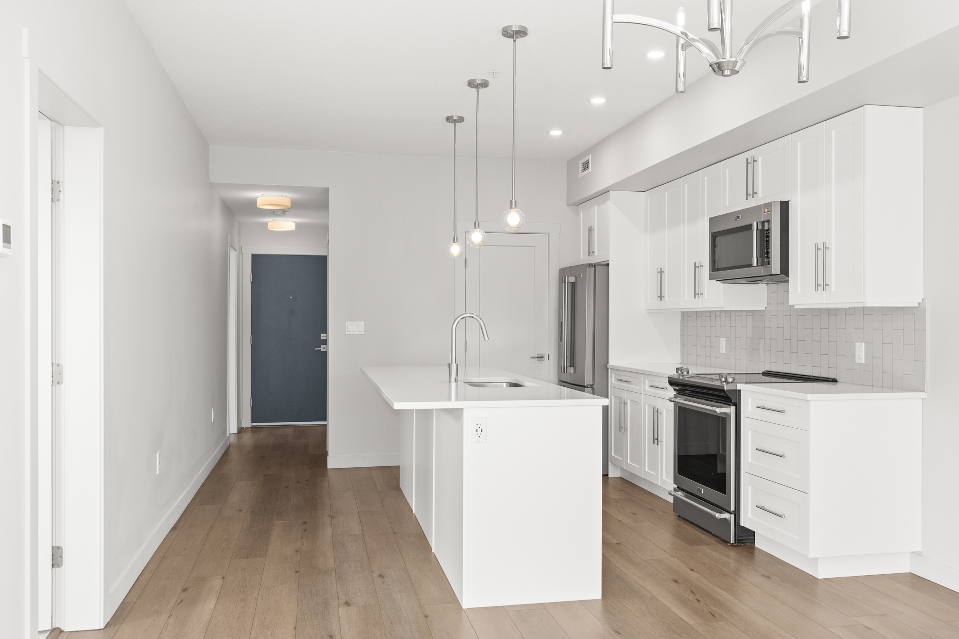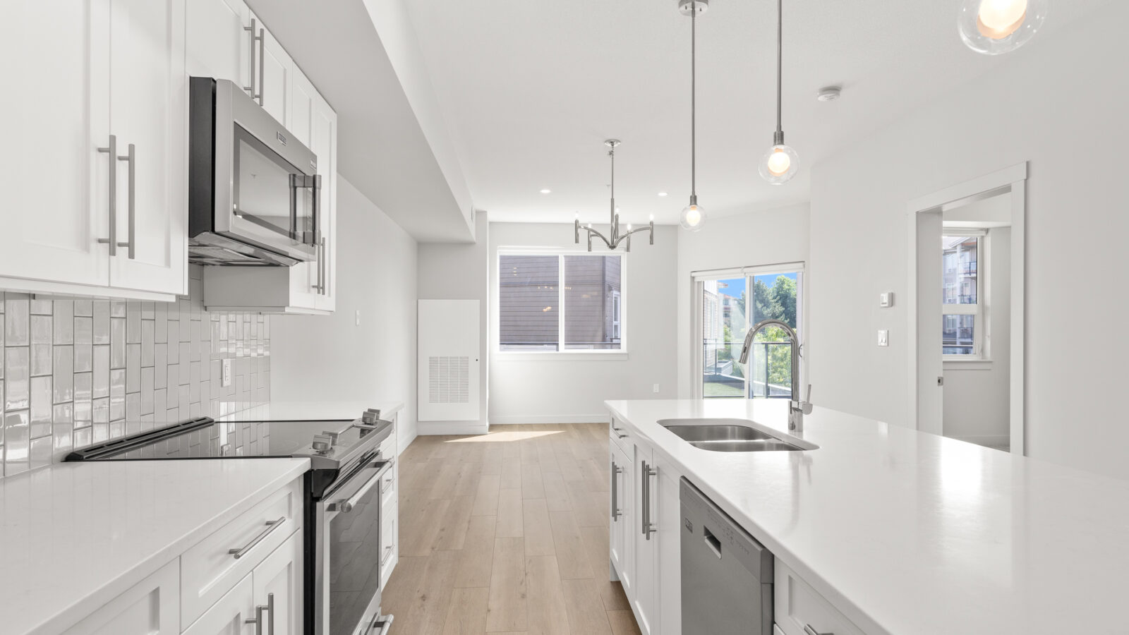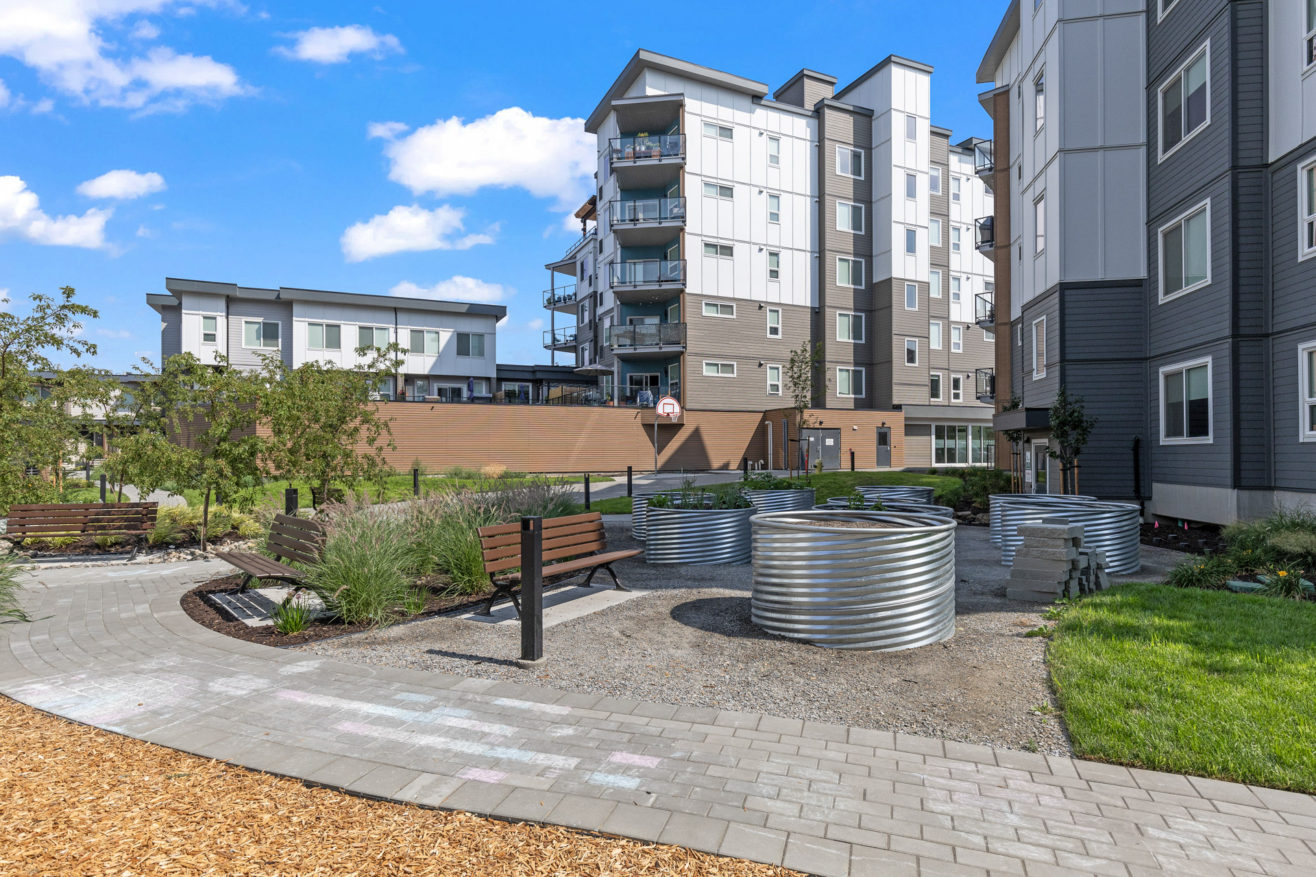 Nestled in Kelowna’s Lower Mission, just minutes to the lake, this 2 bedroom, 2 bathroom contemporary condo is in close proximity to top-rated schools, shopping centers, dining options and recreational facilities. Green Square Vert offers spacious living with high ceilings and well-appointed rooms. Upon entering you will notice the open-concept kitchen, equipped with top-tier Maytag appliances and a sizable island with seating for four, perfect for casual meals or entertaining guests. Rich wide-plank flooring combined with elegant lighting, creates an open and airy atmosphere. A key feature of this condo is the expansive east-facing patio, ideal for enjoying morning coffee or unwinding in the evenings, complete with a gas hookup for outdoor cooking. Included are a Whirlpool washer and dryer, a conveniently located storage locker near the unit, and two secure parking spots in the garage, along with bike storage. Residents can enjoy an array of amenities within the building, such as a fully-equipped fitness center, landscaped gardens with a children’s play area and basketball net, as well as a rooftop patio perfect for admiring city views. Pet owners will find convenience in the dedicated dog wash station and the pet-friendly policy without size restrictions.