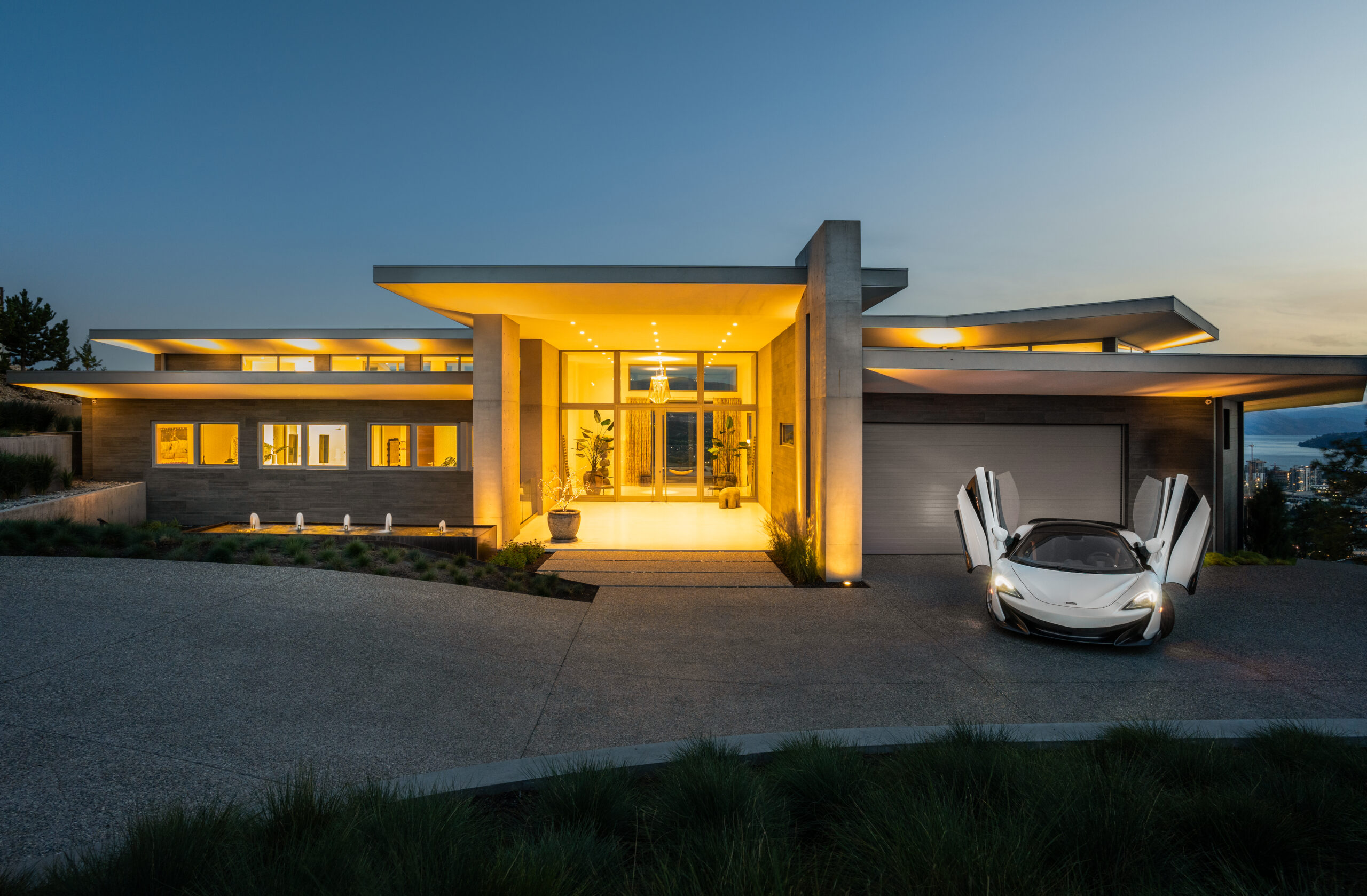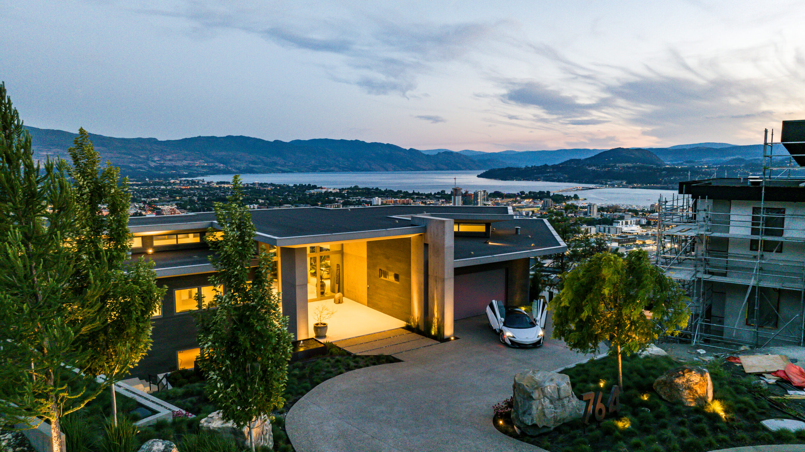 Welcome to this architectural home with world class attention to detail, in Kelowna’s exclusive enclave of Highpointe. The grand entryway greets with lush landscaping and corten steel water feature to enhance the luxurious Italian tile and polished concrete of the foyer. Immediately you are captivated by breathtaking views of the city and lake through the floor-to-ceiling windows. The main living space contains the great room which opens onto the kitchen, finished with custom Italian cabinetry and integrated Wolf & Sub-Zero appliances. The expansive patio & pool deck stretches the length of the home, providing limitless outdoor living. The primary suite is designed to take full advantage of the views, and flows seamlessly to the pool deck. Finishing this level are two more stunningly appointed bedrooms, and a large flex room perfect for a games room, bar/lounge, or gym – also with access to the pool deck. Downstairs is a stylish lounge with wet bar perfect for enjoying music and movies, plus an additional bedroom, bathroom, kitchenette, and recreation area. The entire home features radiant heated polished concrete flooring. The garage features a car elevator, which accesses the 2,690sqft finished lower level garage space, which could be customized to meet virtually any use, complete with independent heating and air filtration. This home was constructed mainly with concrete and steel, Incorporating extensive steel beams and cantilevered spaces. This masterpiece stands apart.