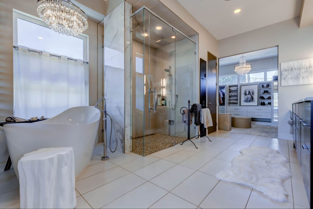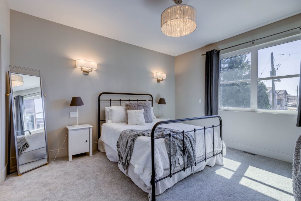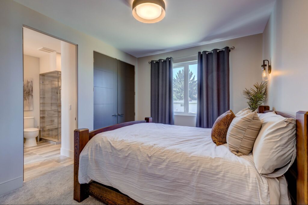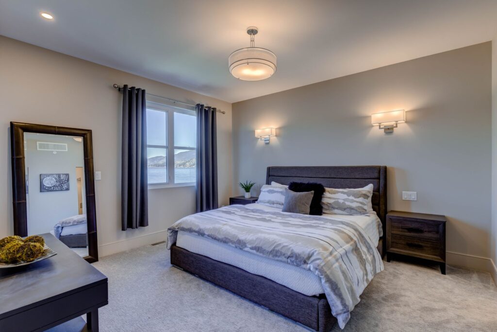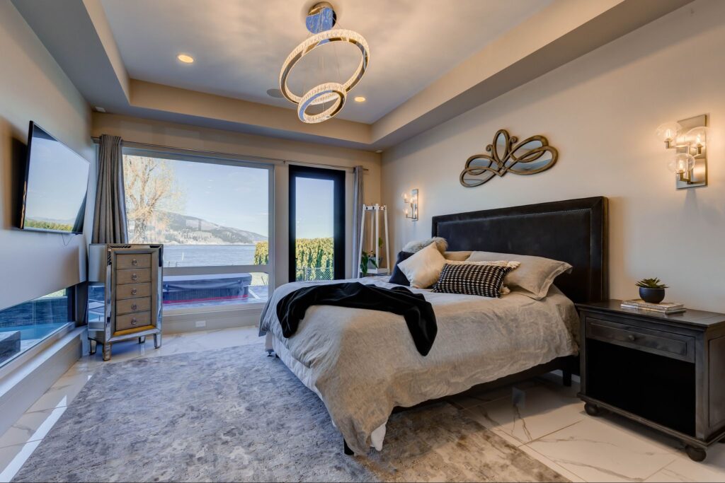 - Spacious master bedroom with expansive lake-views, access to lakeside patio and hot-tub, and professionally finished walk-in closet with his/hers organizers, cabinetry, hanging racks, and washer/dryer.