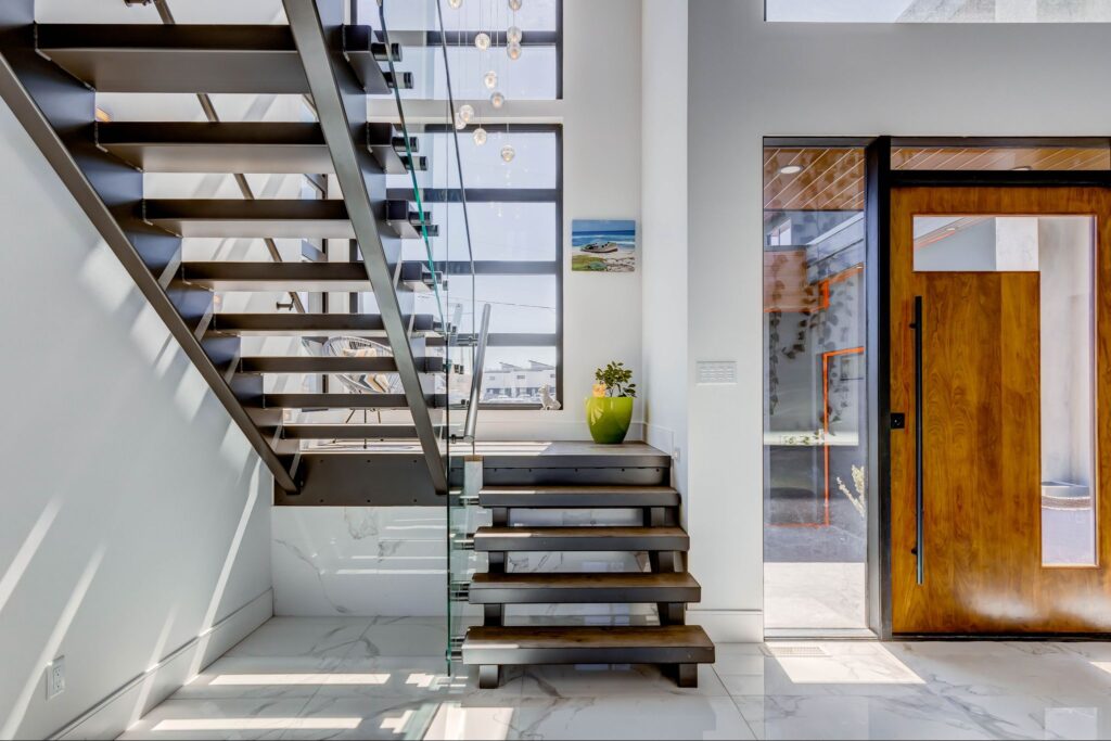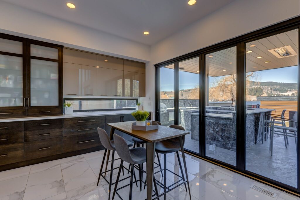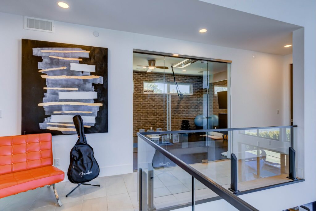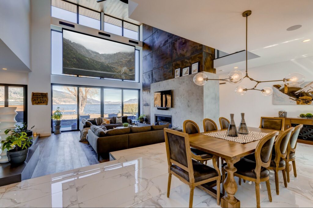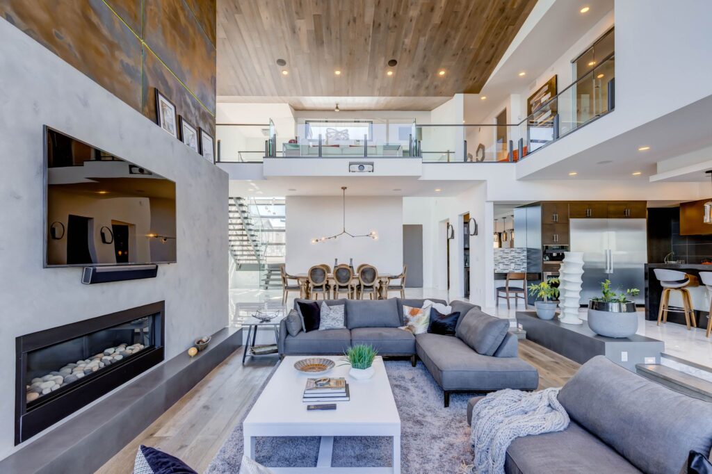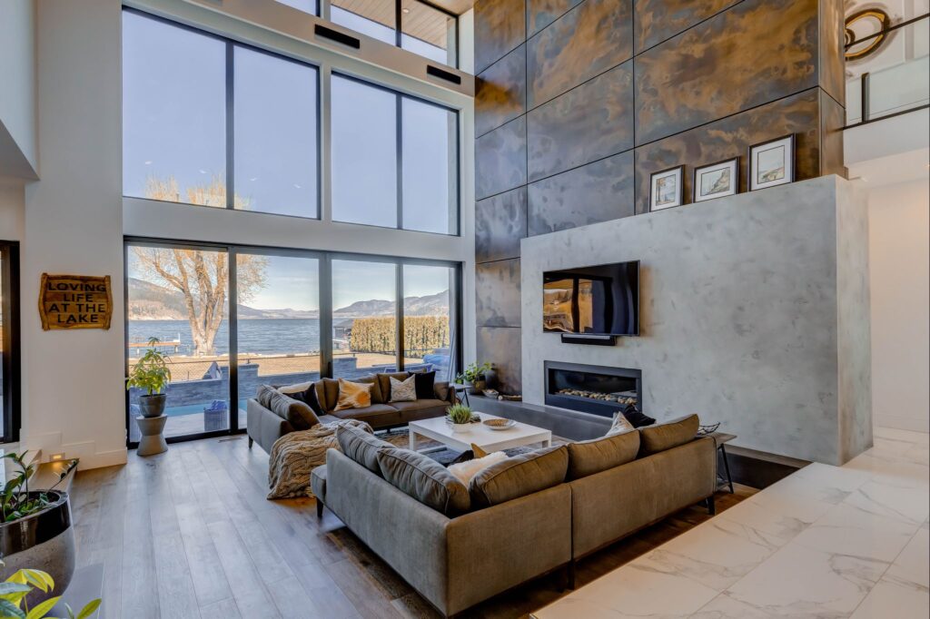 - Floor to ceiling windows in great room with copper toned steel feature wall (w/ built-in lighting), projector screen, and gas fireplace.
