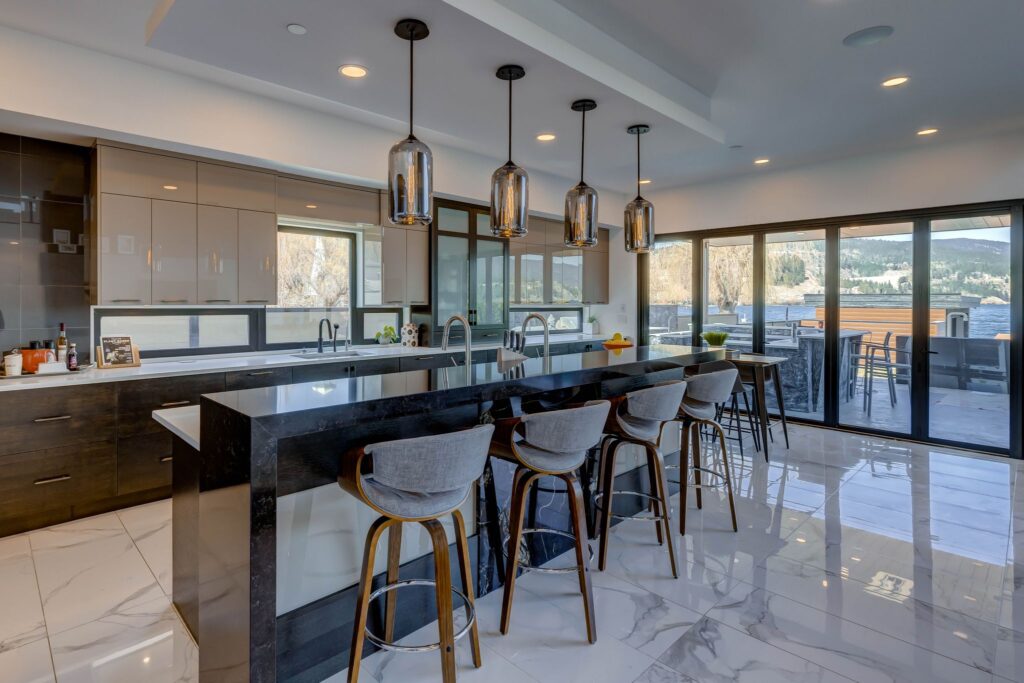 - Superb kitchen with 3 dishwashers, gas-stove, oversized center island with pendant lighting and raised seating bar, and butler’s pantry with over-flow storage.